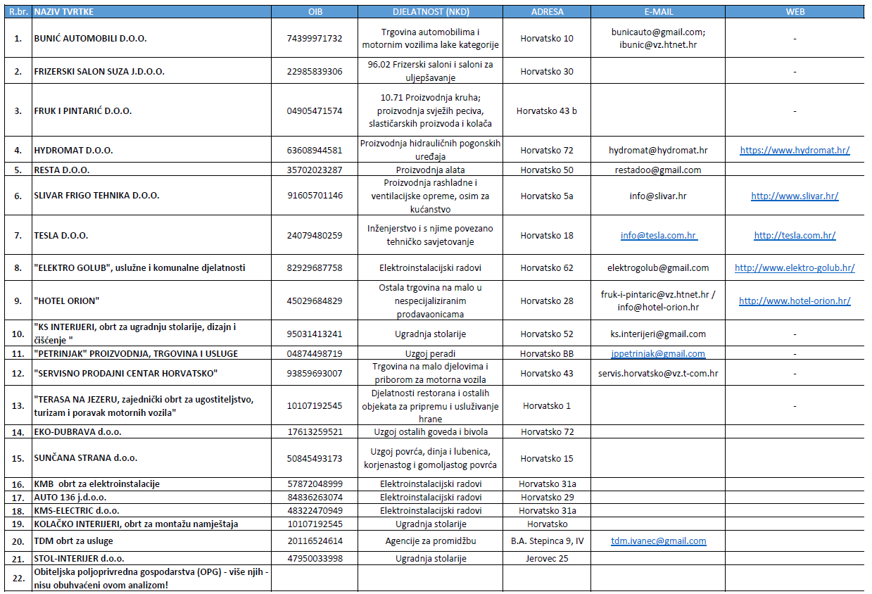 | R.br. | NAZIV TVRTKE | OIB | DJELATNOST (NKD) | ADRESA | WEB | |