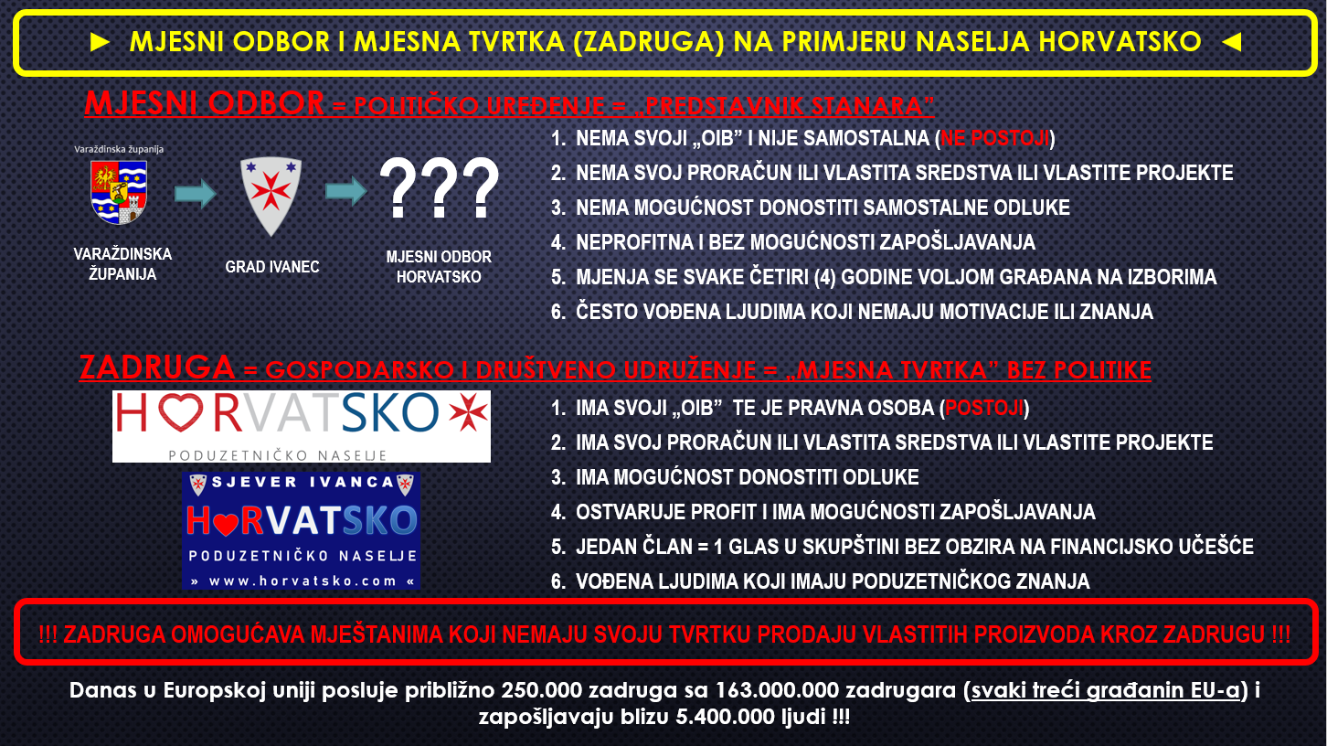 Temeljem dugogodišnjih težnji za decentralizacijom i želje mještana za time da naselje ima svoje ciljeve i svoj budžet, a temeljem Zakona o zadrugama (NN 34/11, 125/13, 76/14, 114/18, 98/19) ( https://www.zakon.hr/z/458/Zakon-o-zadrugama ), u nastavku predstavljamo Zadrugu „HoRVATSKO poduzetničko naselje“ u osnivanju.